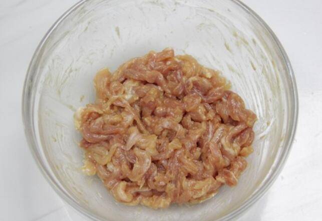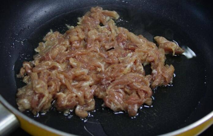 9.锅里放入适量的花生油,把前面腌制好的瘦肉丝倒入锅中,翻炒。