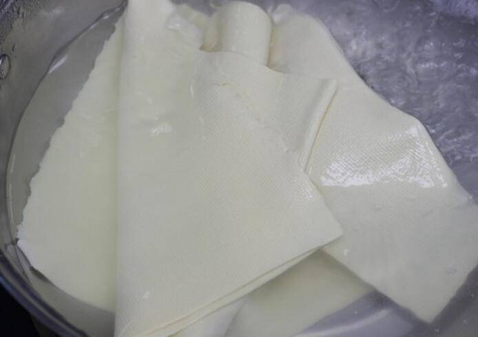6.豆腐皮用开水烫熟,捞出备用,记得不要切段,需要一整块大的。