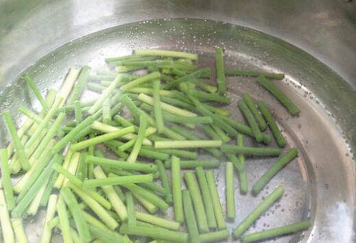 3、蒜苔入锅焯水后捞出沥干水。