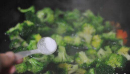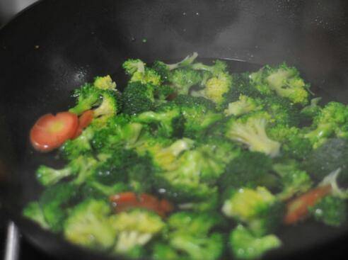 6、油锅烧热,将西兰花倒进去,稍微翻炒,将淀粉水沿着锅边淋入。