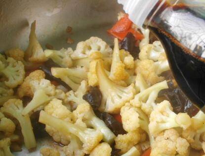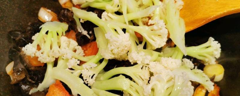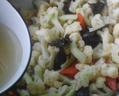 7、倒入菜花,翻炒均匀,加入鸡汤煮1分钟。