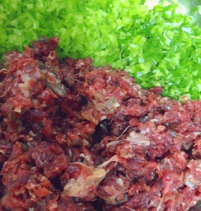 驴肉洗净用料理机打成肉泥,芹菜洗净用料理机打成菜馅,小葱打成葱花,全部混到一起。