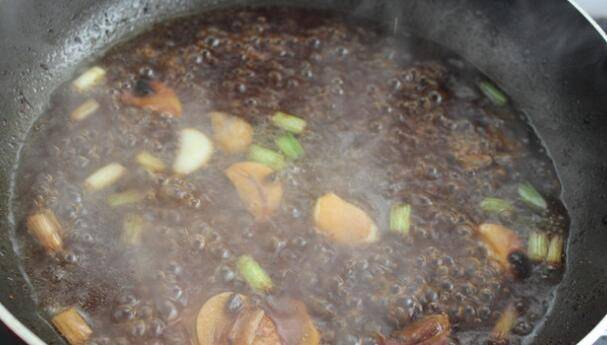 5、直接用锅里的油,放1汤匙豆瓣酱炒出味道,放入姜蒜煸香,再放入葱白,加入2汤匙料酒。