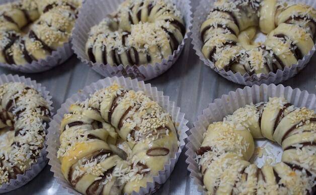 13、盖上保鲜膜,放烤盘中第二次发酵发至两倍大,表面刷鸡蛋液,撒上白芝麻和椰蓉。