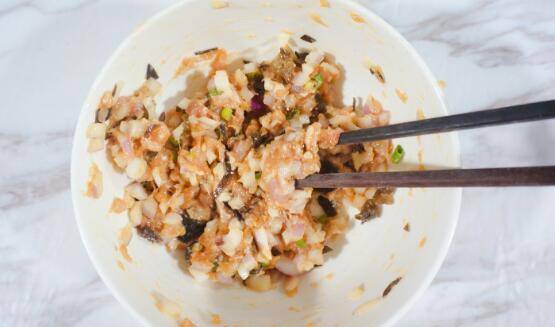 6、接着放入洋葱,和木耳顺时针搅拌上劲。