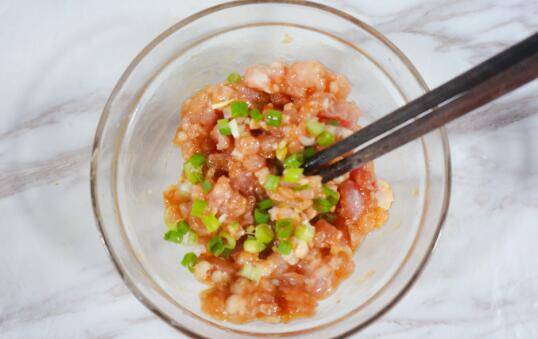 4、猪肉馅里倒入1勺酱油、1勺香油,顺时针方向搅拌。