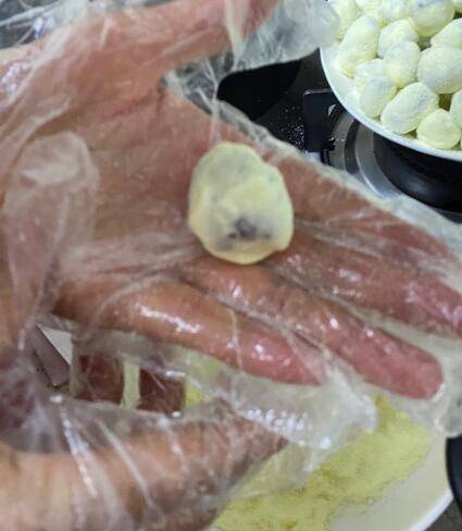 趁热把它们分离,搓圆,放入盘中裹一层奶粉,防粘。