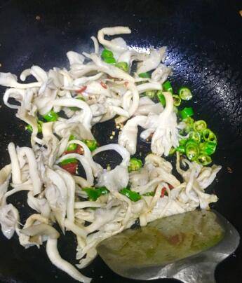 放入姜蒜片爆香,鸡肉炒至变色,盛起一旁备用。再放点油,把小青椒和辣椒爆香,放入平菇翻炒均匀。