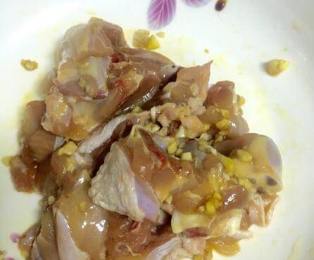平菇用盐水浸泡十分钟,鸡腿肉切成小块,用盐、生抽、白胡椒粉、姜粒和蒜粒搅拌均匀腌制。