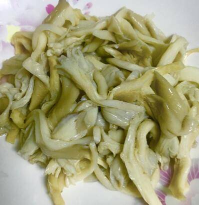 捞出平菇用凉水冲洗,用手捏干水分,然后把平菇撕成一条条。注意:一定要捏干水分再撕,不然炒起来的口感没那么好。