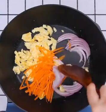 倒入洋葱 胡萝卜 香肠 青菜翻炒均匀。