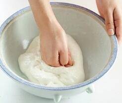 4、趁水分未干,手握成拳状,把水分揣进面团里,直至所有水分和面团融合,再次形成光滑面团。这个踹水的步骤至少重复3次,把剩余的水分都揣入面团中。