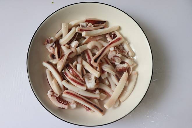 2、鱿鱼洗净去内脏切成条,韭菜切段。