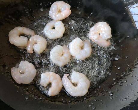 焯好的蔬菜沥水捞出,锅中适量油,烧至7成热,下入虾仁滑炒至变色。