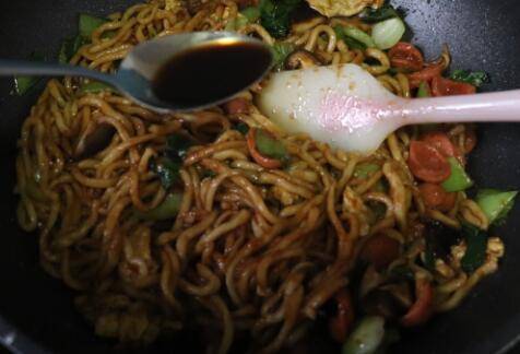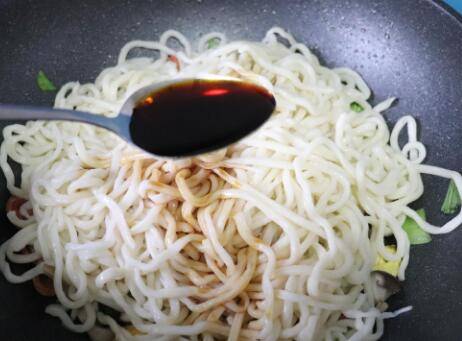 加入鸡蛋和手擀面,加入3勺生抽酱油,1勺老抽酱油。