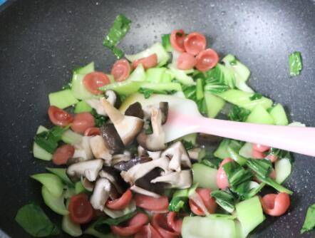 锅中加入适量食用油,下香肠翻炒,再下油菜,翻炒一会。
