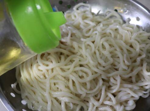 面过一下凉水,盛出沥干水份,面中加少许食用油,搅拌一下,防粘连。