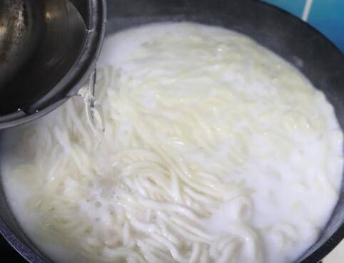 锅中添加适量水,烧开,下手擀面,锅开两次,点两次凉水,出锅,不可煮太久。
