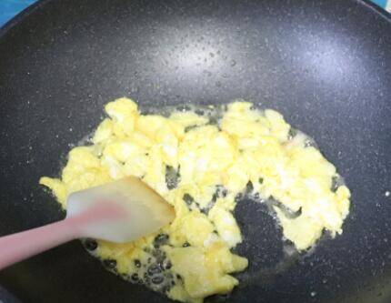 热锅凉油,打入鸡蛋液,稍微凝固后,用铲子铲成小块,盛出备用。