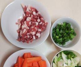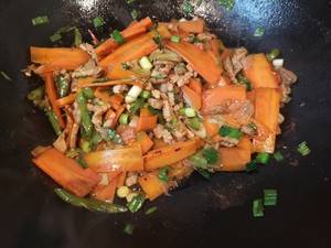 用料:胡萝卜3根、肉150克、大葱1根、青椒3个、朝天椒2个、青蒜2根、老抽半勺、生抽1勺、盐适量。