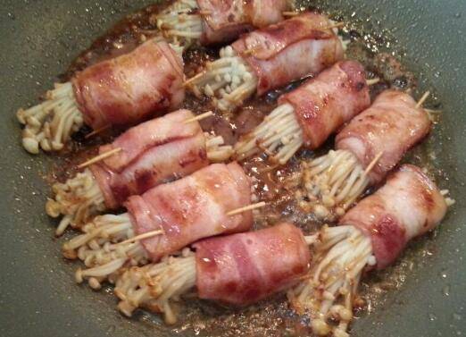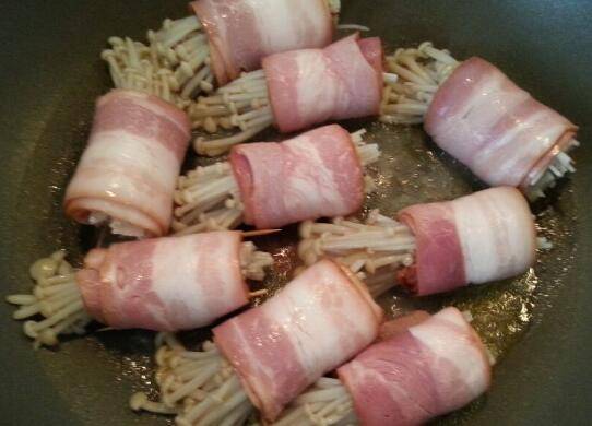 6、放入培根金针菇卷小火慢煎,煎的时候勤翻面,让培根一圈都煎至金黄。