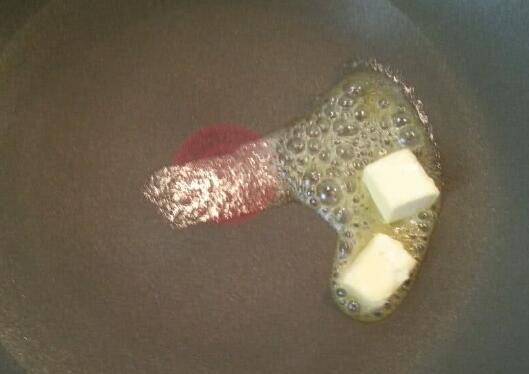 5、锅烧热后放入黄油融化。没有黄油也可以用植物油。