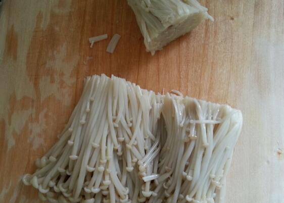 2、煮熟以后捞出放冷水里过一下再捞出捏去金针菇里的水分然后切掉金针菇的根部。