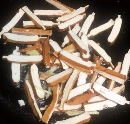 放入切好的香干,再放切好的芦蒿,翻炒均匀。