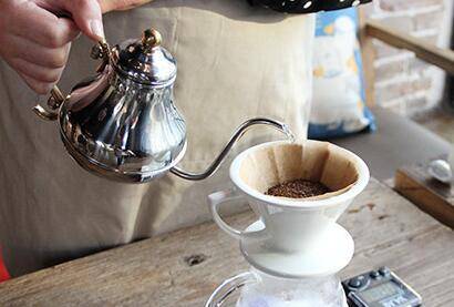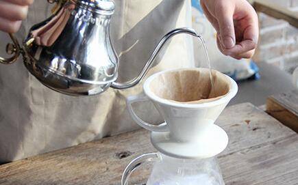 5、把磨好的咖啡粉放入滤纸中,围绕滤杯中心绕圈缓缓注入水,烘焖蒸15秒。