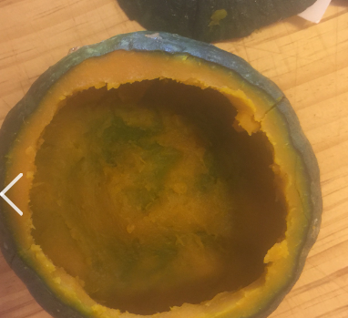 1、将一整个贝贝南瓜在微波炉中加热8分钟左右至熟。可以分多次叮,变化南瓜位置使其受热均匀。