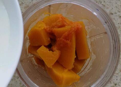 4、将蒸熟的南瓜放进料理机中,倒入准备好的牛奶。