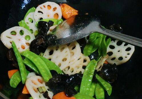 木耳泡发,胡萝卜切片,莲藕切片,荷兰豆去除筋,并准备好水淀粉。