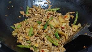 1、猪肉切丝,放入2勺生抽,1小勺盐,半勺郫县豆瓣,1小撮胡椒粉,2小勺淀粉,1勺食用油,抓拌均匀。腌制10分钟。