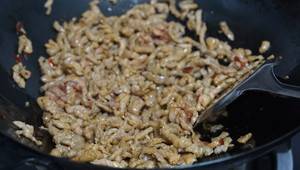 3、锅里倒入适量油,比平时炒菜稍微多放一点,油烧至6成热以后,放入腌制好的肉丝。