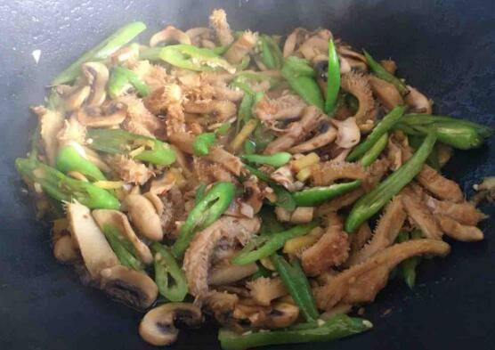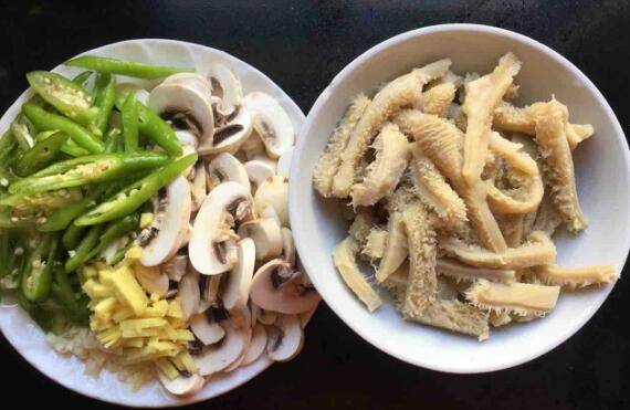 用料:熟牛肚300克、白蘑菇200克、青椒5个、生姜5克、大蒜3瓣、料酒2勺、生抽2勺、白糖半勺、盐少许、鸡粉少许。
