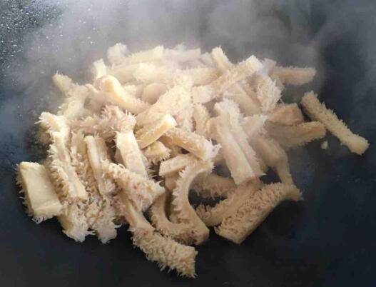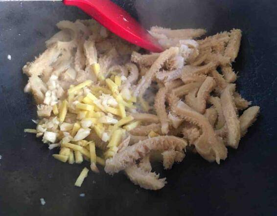 2、起锅,倒入适量食用油,油热后倒入牛肚不停煸炒2~3分钟。