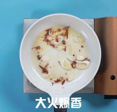 倒入食用油,加葱姜蒜和干辣椒,大火爆香。