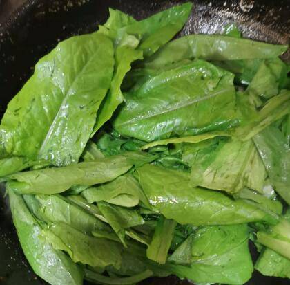 3、倒入油麦菜翻炒。加入适量盐和鸡精。翻炒出锅。