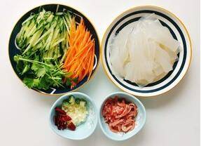 1、黄瓜、胡萝卜、猪肉切丝。