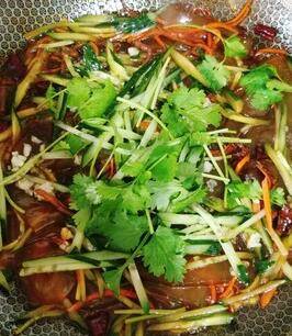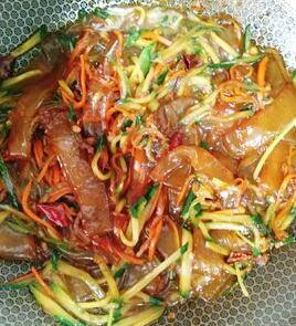 6、下入拉皮炒散,汤汁略收干,再下入黄瓜。