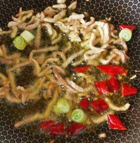3、锅中加入少许食用油,炒香肉丝,下入辣椒煸炒。