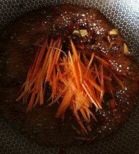 5、下入胡萝卜丝,翻炒均匀。