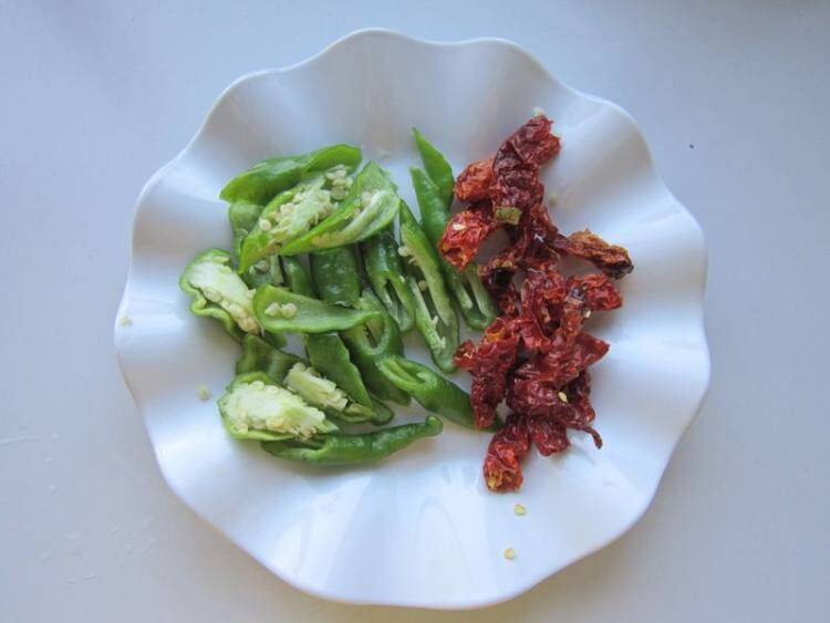 7、加青红辣椒翻炒出香味(大约2分钟)。