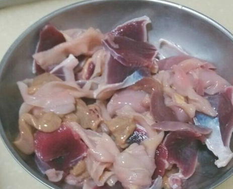 将鸡杂打整干净并且切成图片中的大小;
