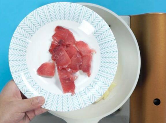 放入花椒,倒入猪肉片,翻炒至变色;