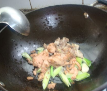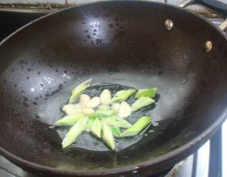 放入葱花炒出香味;