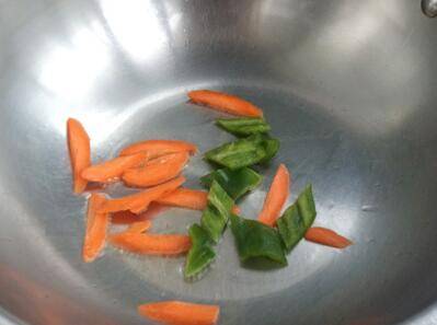 起油锅,胡萝卜、青椒入锅过油后盛出。