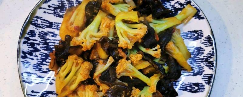 用料:菜花500克、木耳100克、油适量、盐3克、糖2克、生抽1茶匙、蚝油1茶匙、姜8克、八角1个、桂皮3克、大蒜10克。