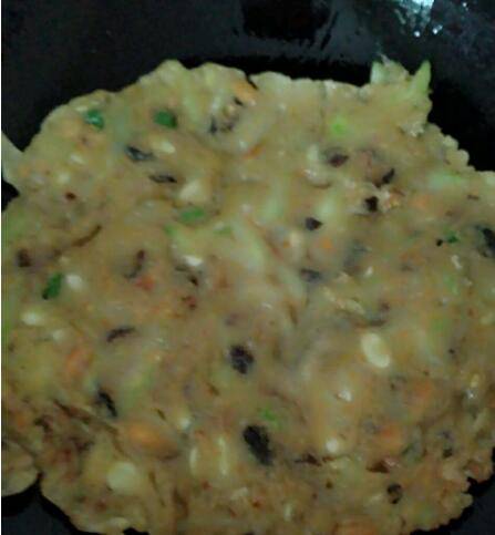 5、热锅后,放浆,摊薄,没凝固时别动,当转动锅时,说明很快可以翻面了,煎至二面金黄,即可起锅。