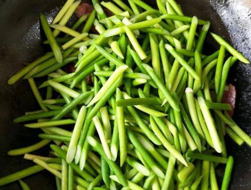 3、过好后把蒜苔过一下凉水,这样会保持蒜苔颜色碧绿。